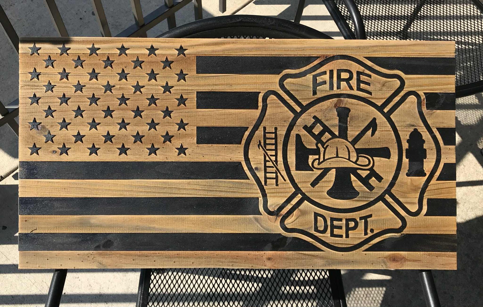 This handcrafted 24" x 12.56"x1" wooden flag features a bold, laser-engraved design honoring our firefighters. The American flag layout is paired with a detailed firefighter Maltese cross, creating a striking and meaningful display piece. Laser engraving brings out crisp lines and deep contrast for a durable, long-lasting finish.